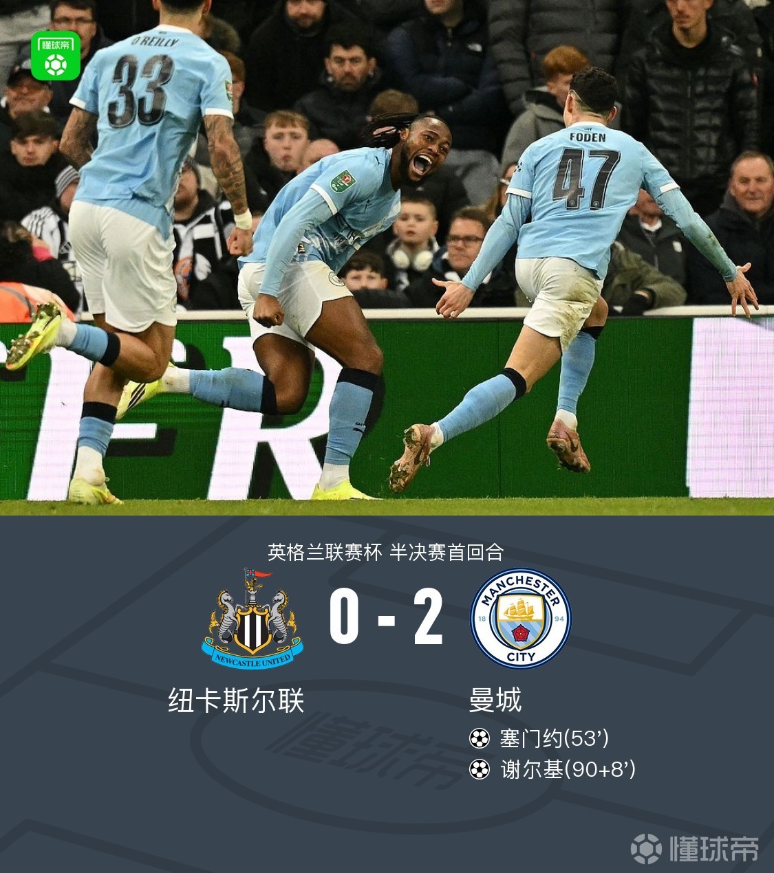 北京时间1月14日4:00,英联杯半决赛首回合,曼城作客圣詹姆斯公园球场挑战纽卡斯尔联,本场主裁判为卡瓦纳。上半场,维萨错失良机,墨菲伤退,双方均0射正。下半场,塞门约打破僵局,艾特-努里助攻谢尔基破门锁定胜局。最终,曼城2-0客胜纽卡,占晋级先机。点击查看本场比赛详细数据>>点击查看英联杯完整积分榜>>关键事件第53分钟,多库传中,B席前点一垫,塞门约包抄破门,曼城打破僵